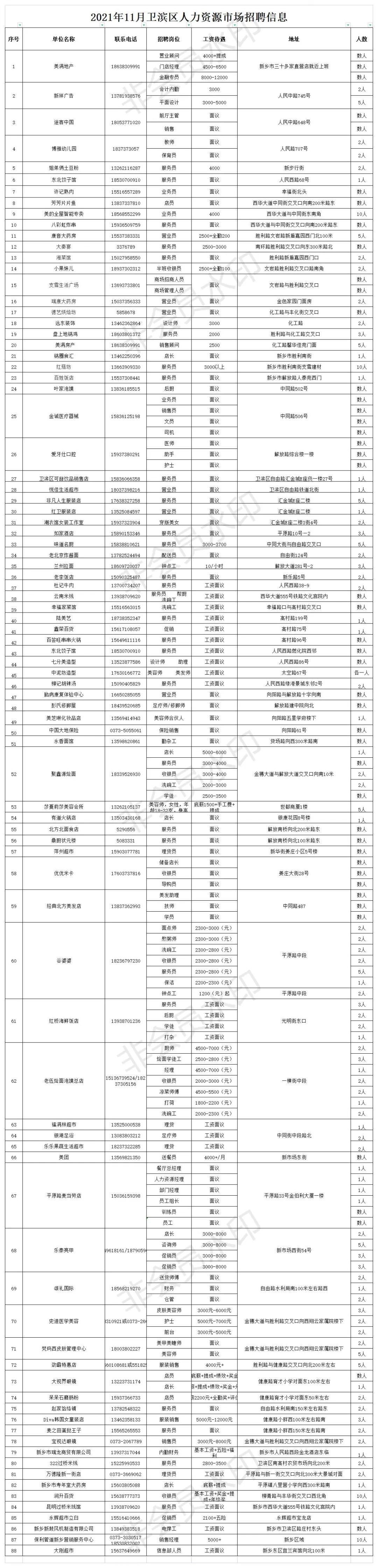 本次卫滨区人力资源11月份招聘信息发布,共有88家企业,93种岗位,预计招聘500