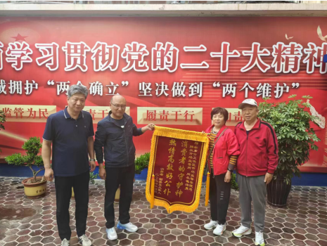 4月15日上午,消费者谢女士及家人将一面写有:消费者的守护神,热情高效好公仆”的锦旗,送到卫滨区市场监管局办公室,以表达对该局解放市场监管所所长崔海勇快速高效帮她退回货款的感激之情。