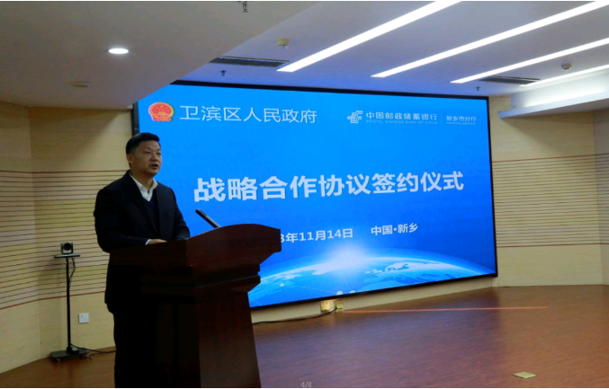 11月14日上午,卫滨区政府与邮政储蓄银行新乡分行签署战略合作协议,签约仪式在邮储银行新乡分行举行。区委书记李海潮,区长魏海晓,区委常委、常务副区长郭呈杰,区委常委、统战部长周伟,区委常委、副区长李付晋,区政协副主席、财政局局长向卫群和邮政储蓄银行新乡分行党委书记、行长白俊岭,邮储银行新乡分行班子成员以及卫滨区相关单位负责同志参加签约仪式。