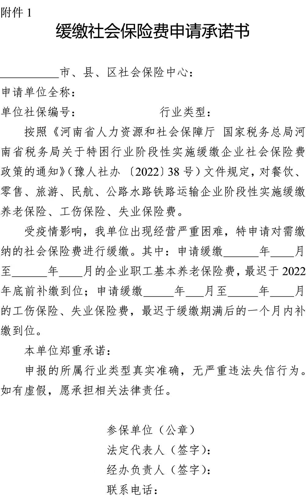 为贯彻党中央、国务院、省委、省政府、市委、市政府决策部署,根据《河南省人力资源和社会保障厅 国家税务总局河南省税务局关于特困行业阶段性实施缓缴企业社会保险费政策的通知》(豫人社办 〔2022〕38号)文件精神,结合我市实际,现对餐饮、零售、旅游、民航、公路水路铁路运输企业阶段性实施缓缴养老保险、失业保险、工伤保险费(以下简称“三项社会保险费”)政策的有关事项通告如下: