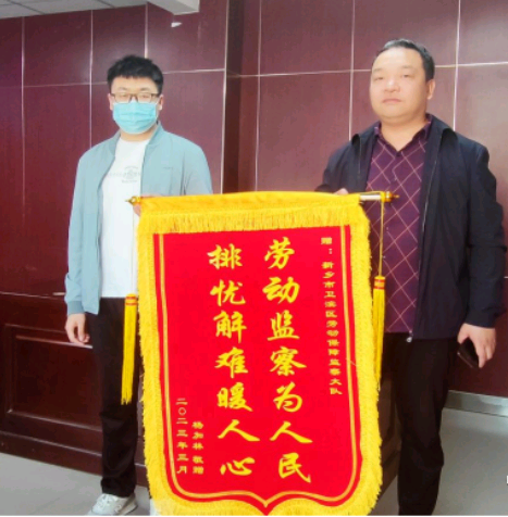3月6日下午,家住牧野区的杨某将一面写有“劳动监察为人民 排忧解难暖人心”的锦旗送到卫滨区劳动保障监察大队办公室,以表达对工作人员帮其讨要血汗钱的感激之情。