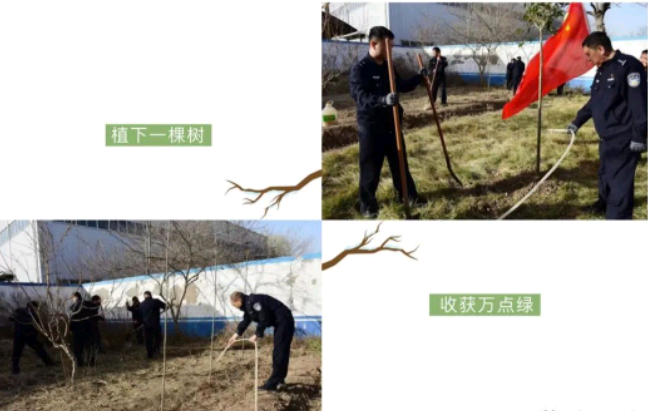 在派出所院内,参加植树活动的民辅警们热情高涨,干劲十足,三五一组,分工合作。你挥锹挖坑,我扶树培土,大家分工明确,相互协作,各个环节衔接有序、配合默契。