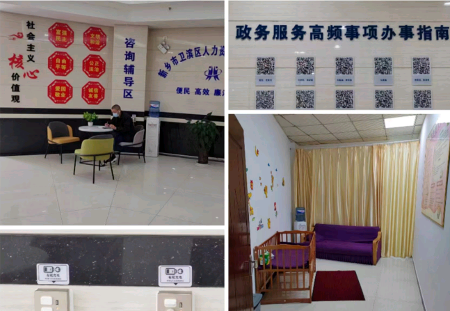 “高配”设施,营造一流大厅环境。卫滨区政数局重新整合资源、优化设计,将门口大门换成通透的玻璃门,设置导引台提供免费咨询及帮办代办服务,新装厅内高端大气、音质清晰的LED大屏,开辟独立填表区域,定制个性化叫号系统,在自助服务区配置电脑等自助设备,打造“政务服务高频事项办事指南”二维码墙,提供手机充电、饮用水、休闲椅、医药箱、Wifi等免费便民服务设施,为哺乳期女性提供母婴室,为残障人士提供无障碍通道、无障碍沟通渠道等,营造宽敞、明亮、现代、全新的政务服务大厅环境。