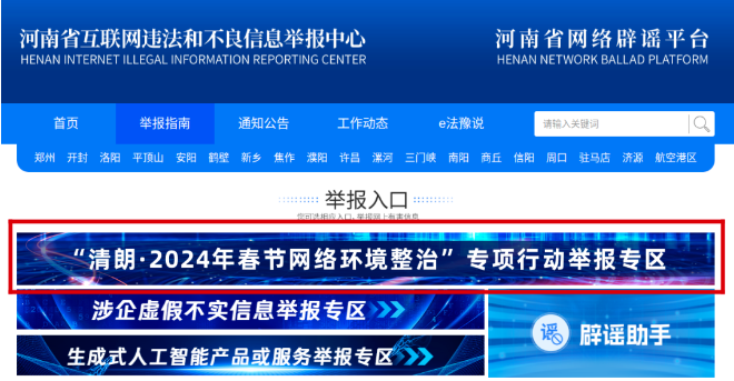 河南省委网信办开通“清朗·2024年春节网络环境整治”专项行动举报专区
