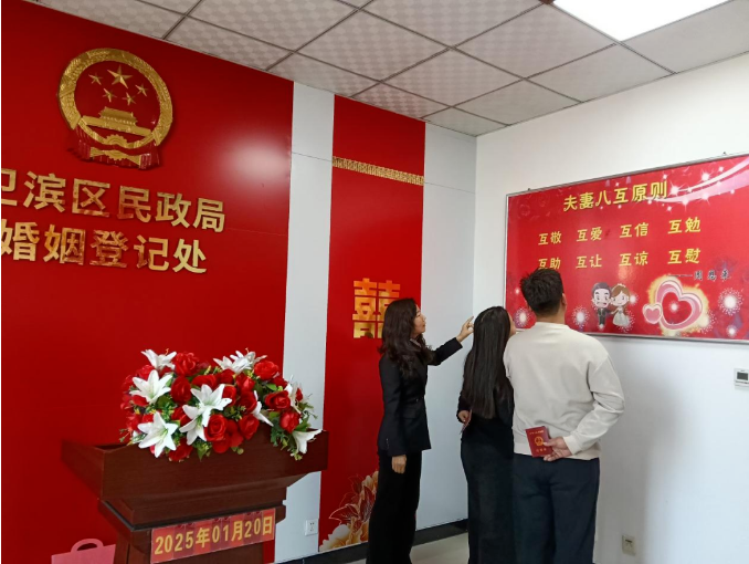 完善婚姻辅导阵地。一是改造提升婚姻登记处环境。2023年7月,卫滨区婚姻登记处搬迁至卫滨区政务服务中心二楼,设置婚姻家庭辅导室,营造“让爱从这里出发”的氛围,从源头上减少婚姻家庭纠纷的产生;设置谈心室、婚姻调解室,为离婚登记人员提供安静的独立场所,保护群众隐私。二是整合专业人员力量。通过部门联合、招募志愿者等方式引入具备社工证、心理咨询师、家庭教育指导师、传统文化讲师等职业资格的专业人员,共同参与婚姻家庭辅导工作。三是加强业务培训管理。组织婚姻登记工作人员和志愿者进行培训,学习相关婚姻管理政策法规、婚姻登记业务知识及婚俗改革内容,提高工作能力和专业水平,更好地服务广大群众。