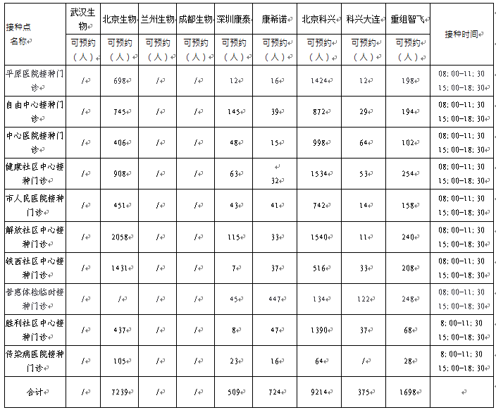 日,卫滨区新冠病毒疫苗有北京生物、兰州生物、深圳康泰、北京科兴、科兴大连、重组智飞、康希诺。可以现场预约名额的接种点如下: