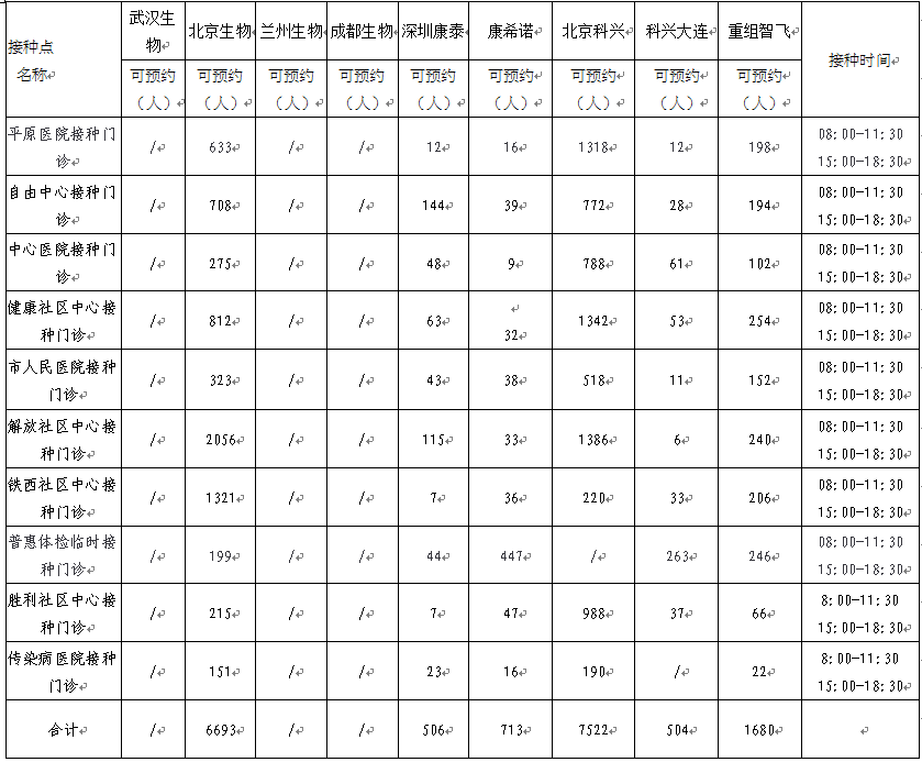 日,卫滨区新冠病毒疫苗有北京生物、兰州生物、深圳康泰、北京科兴、科兴大连、重组智飞、康希诺。可以现场预约名额的接种点如下: