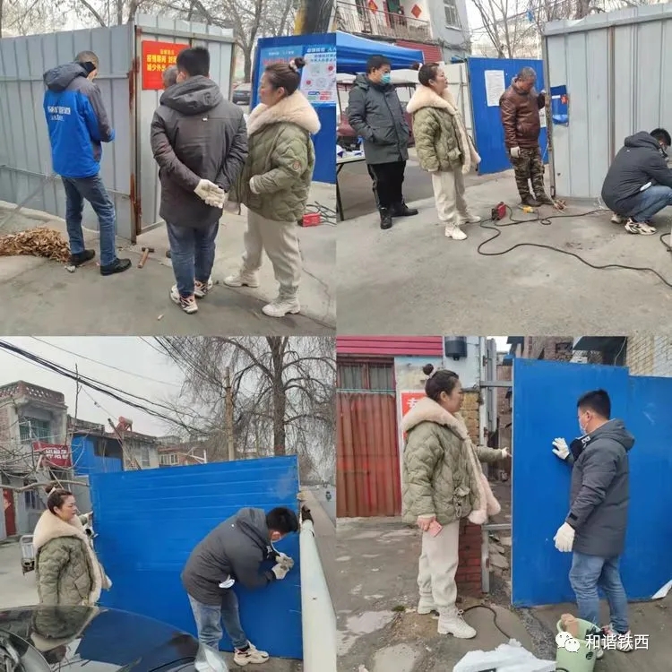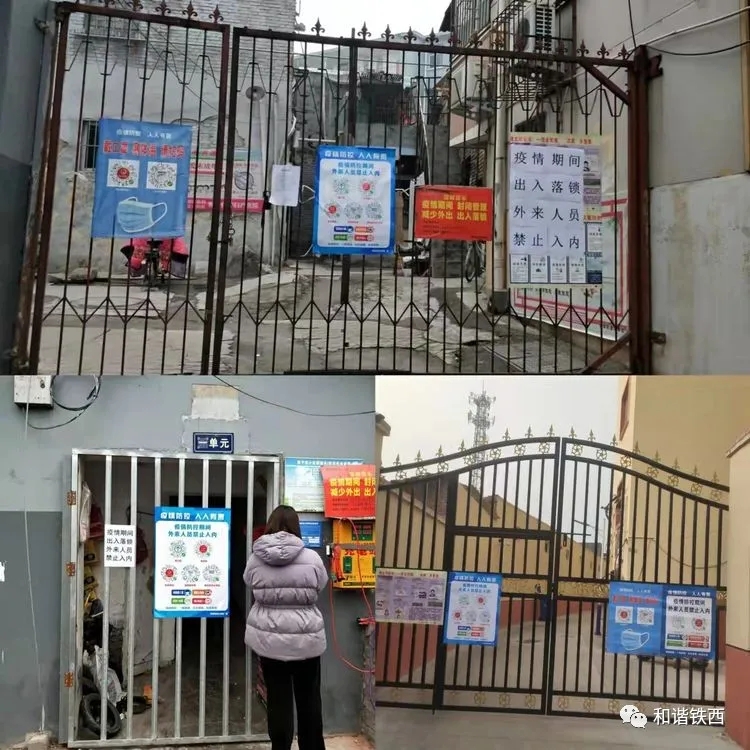 铁西街道工作人员封锁庭院大门,张贴疫情防控告示,对疫情防控工作进行宣传。