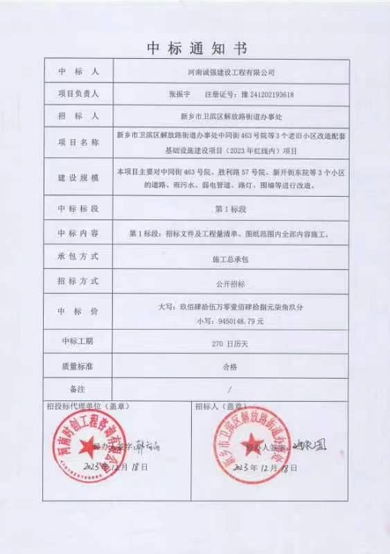 新乡市卫滨区铁西区域城中村改造项目(一期)沈小营雨污水及道路建设项目(小区红线内)合同公示