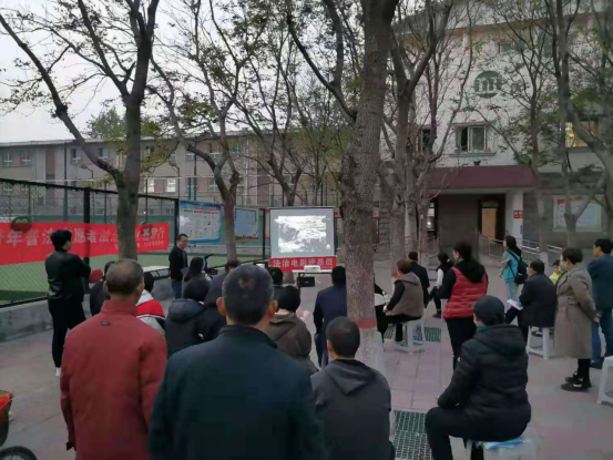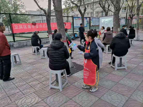 在电影播放的准备环节,卫滨区普法志愿者一边安装播放设备,一边给大家讲解生活中相关的法治小常识,并发放普法宣传页、宪法宣传笔等宣传品,大家不时还会提问一些法律问题。电影播放时,大家还会相互讨论电影情节以及相关的法律知识,现场气氛十分活跃。