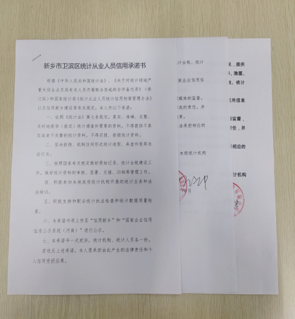 (图为:新乡市卫滨区统计从业人员信用承诺书)
