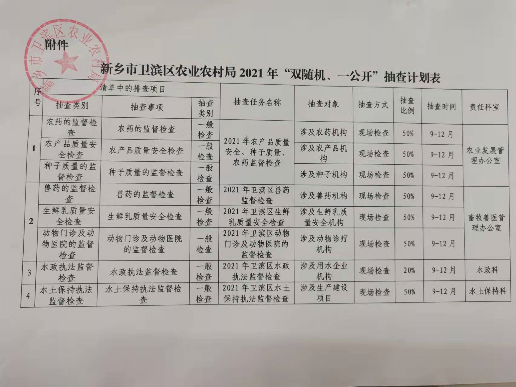 新乡市卫滨区农业农村局制定了2021年“双随机、一公开”抽查计划,并对按照计划表中对各相关企业进行抽查,各企业抽查过程中均未发现问题,抽查结果合格。