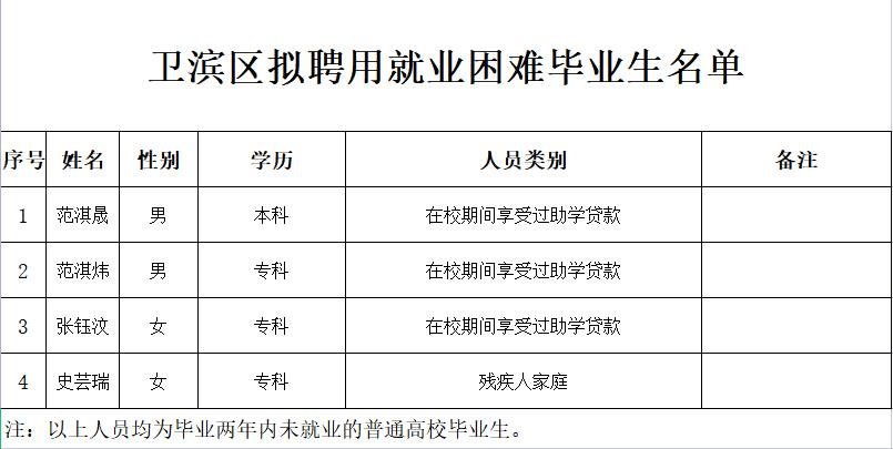 为促进高校毕业生就业,根据河南省人力资源和社会保障厅·河南省财政厅《关于印发河南省公益岗位管理办法的通知》要求,我区开发一批公益性岗位用于安置就业困难毕业生。现将拟聘用名单予以公示,公示期为2022年8月30日—2022年9月5日,如有异议请拨打电话:0373-2048203