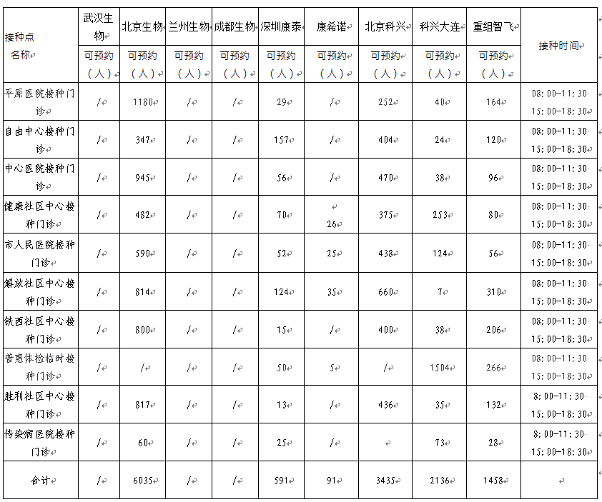 11月25日,卫滨区新冠病毒疫苗有北京生物、深圳康泰、北京科兴、科兴大连、重组智飞、康希诺。可以现场预约名额的接种点如下: