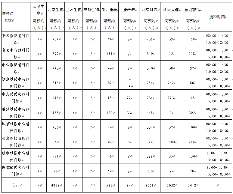 日,卫滨区新冠病毒疫苗有北京生物、深圳康泰、北京科兴、科兴大连、重组智飞、康希诺。可以现场预约名额的接种点如下: