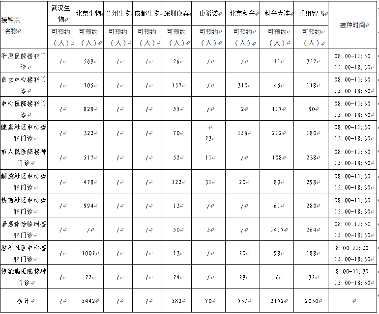 日,卫滨区新冠病毒疫苗有北京生物、深圳康泰、北京科兴、科兴大连、重组智飞、康希诺。可以现场预约名额的接种点如下: