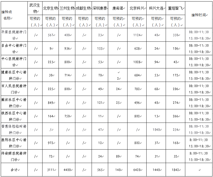 日,卫滨区新冠病毒疫苗有北京生物、兰州生物、深圳康泰、北京科兴、科兴大连、重组智飞、康希诺。可以现场预约名额的接种点如下: