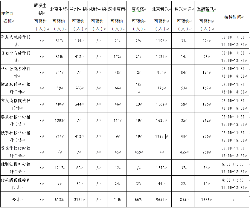 日,卫滨区新冠病毒疫苗有北京生物、兰州生物、深圳康泰、北京科兴、科兴大连、重组智飞、康希诺。可以现场预约名额的接种点如下: