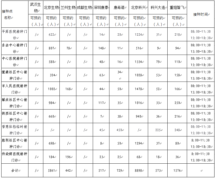 日,卫滨区新冠病毒疫苗有北京生物、兰州生物、深圳康泰、北京科兴、科兴大连、重组智飞、康希诺。可以现场预约名额的接种点如下: