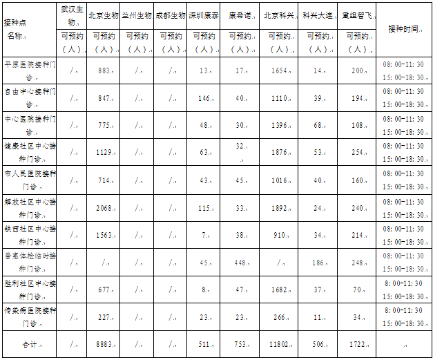 日,卫滨区新冠病毒疫苗有北京生物、深圳康泰、北京科兴、科兴大连、重组智飞、康希诺。可以现场预