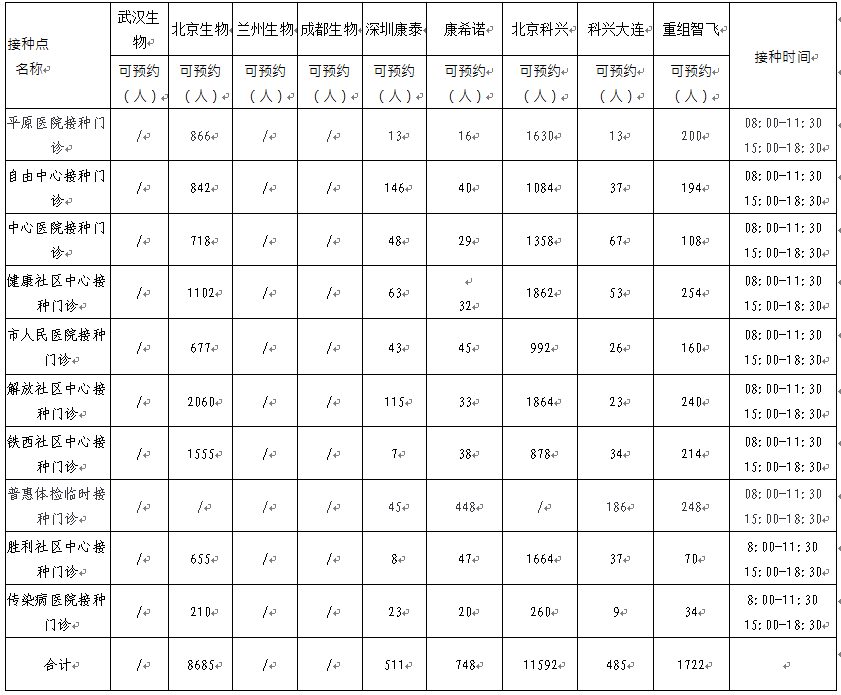 2月4日,卫滨区新冠病毒疫苗有北京生物、兰州生物、深圳康泰、北京科兴、科兴大连、重组智飞、康希诺。可以现场预约名额的接种点如下: