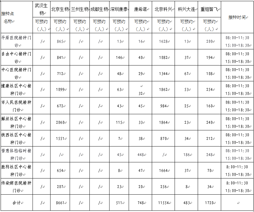 2月5日,卫滨区新冠病毒疫苗有北京生物、兰州生物、深圳康泰、北京科兴、科兴大连、重组智飞、康希诺。可以现场预约名额的接种点如下:
