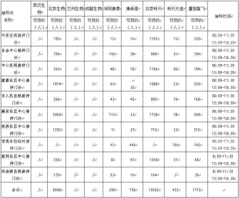 2月10日,卫滨区新冠病毒疫苗有北京生物、兰州生物、深圳康泰、北京科兴、科兴大连、重组智飞、康希诺。可以现场预约名额的接种点如下: