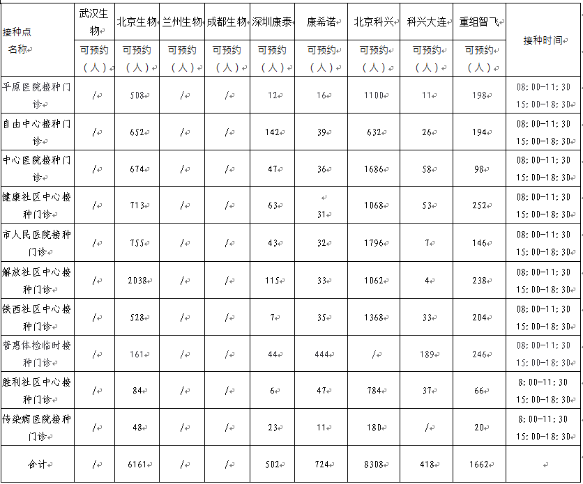 日,卫滨区新冠病毒疫苗有北京生物、兰州生物、深圳康泰、北京科兴、科兴大连、重组智飞、康希诺。可以现场预约名额的接种点如下: