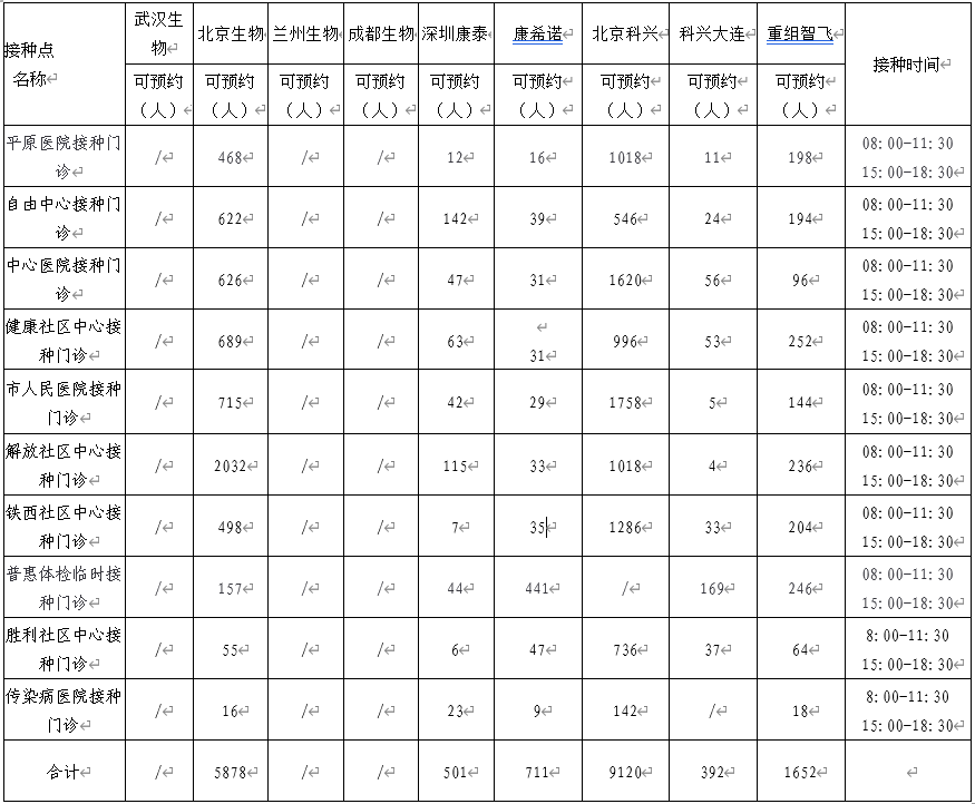 日,卫滨区新冠病毒疫苗有北京生物、兰州生物、深圳康泰、北京科兴、科兴大连、重组智飞、康希诺。可以现场预约名额的接种点如下: