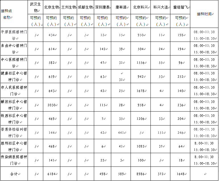 日,卫滨区新冠病毒疫苗有北京生物、兰州生物、深圳康泰、北京科兴、科兴大连、重组智飞、康希诺。可以现场预约名额的接种点如下: