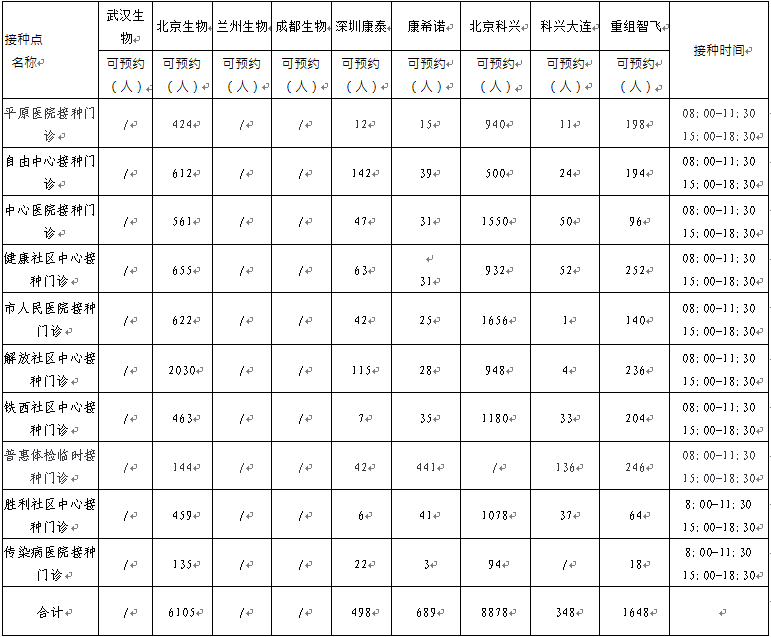 日,卫滨区新冠病毒疫苗有北京生物、兰州生物、深圳康泰、北京科兴、科兴大连、重组智飞、康希诺。可以现场预约名额的接种点如下: