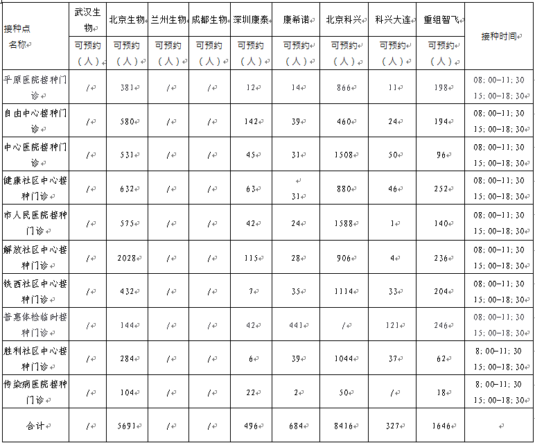 日,卫滨区新冠病毒疫苗有北京生物、兰州生物、深圳康泰、北京科兴、科兴大连、重组智飞、康希诺。可以现场预约名额的接种点如下:
