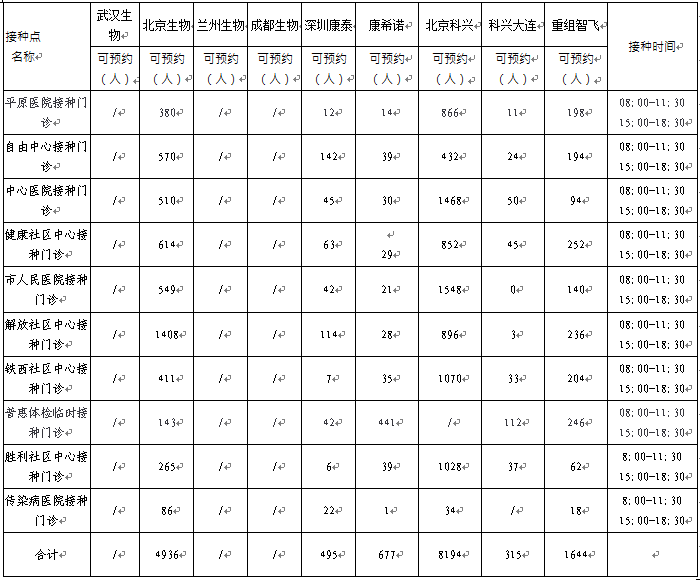 日,卫滨区新冠病毒疫苗有北京生物、兰州生物、深圳康泰、北京科兴、科兴大连、重组智飞、康希诺。可以现场预约名额的接种点如下: