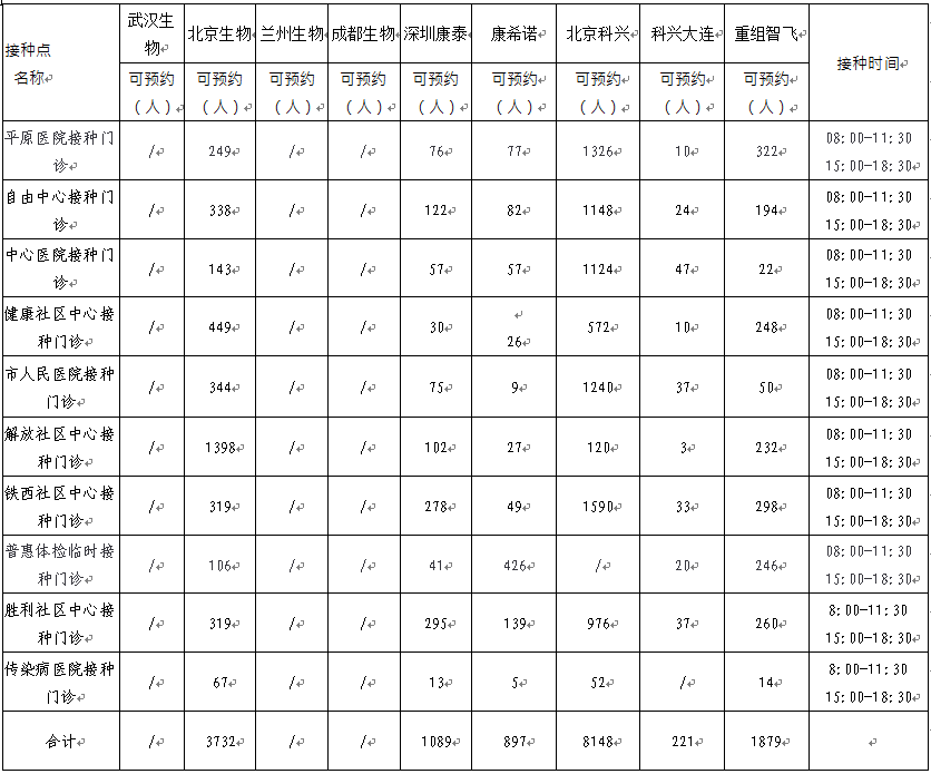 日,卫滨区新冠病毒疫苗有北京生物、兰州生物、深圳康泰、北京科兴、科兴大连、重组智飞、康希诺。可以现场预约名额的接种点如下:
