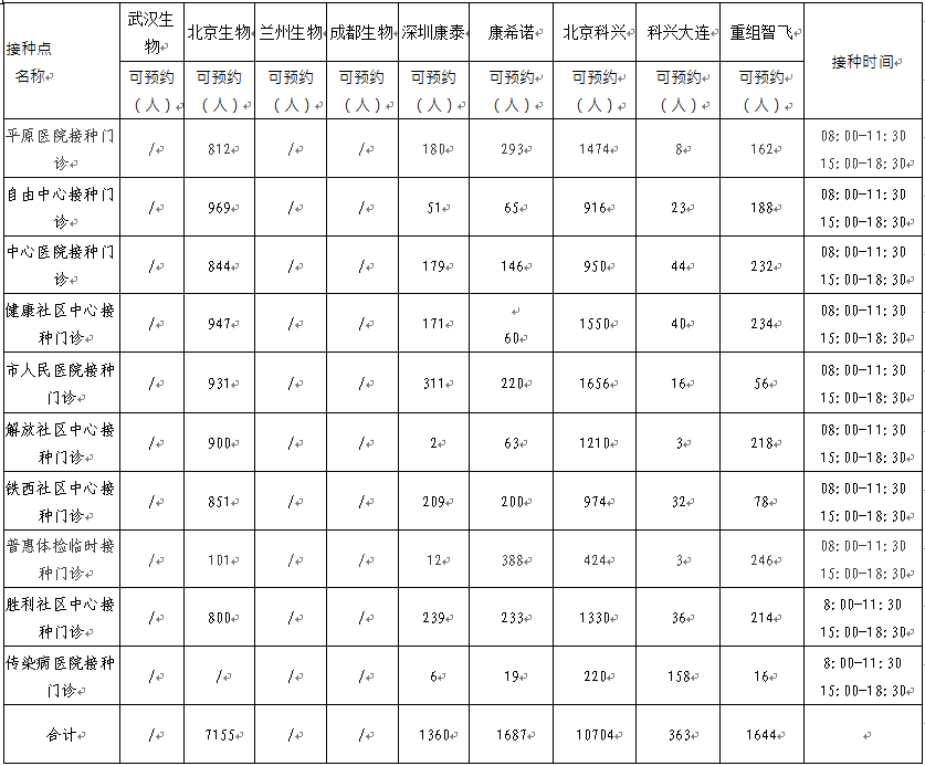 日,卫滨区新冠病毒疫苗有北京生物、兰州生物、深圳康泰、北京科兴、科兴大连、重组智飞、康希诺。可以现场预约名额的接种点如下: