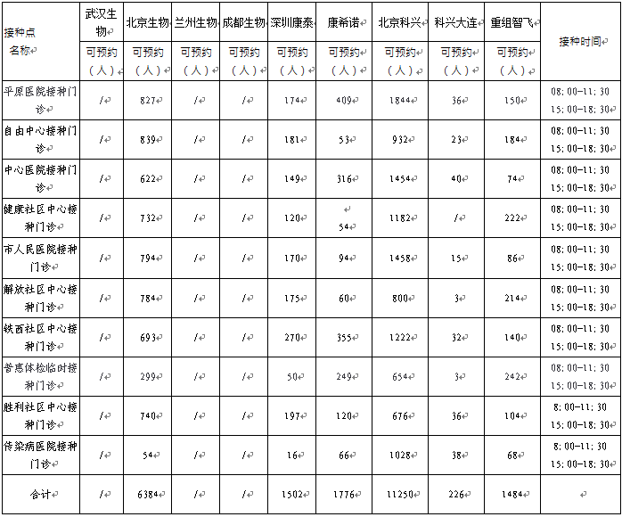 物、深圳康泰、北京科兴、科兴大连、重组智飞、康希诺。可以现场预约名额的接种点如下: