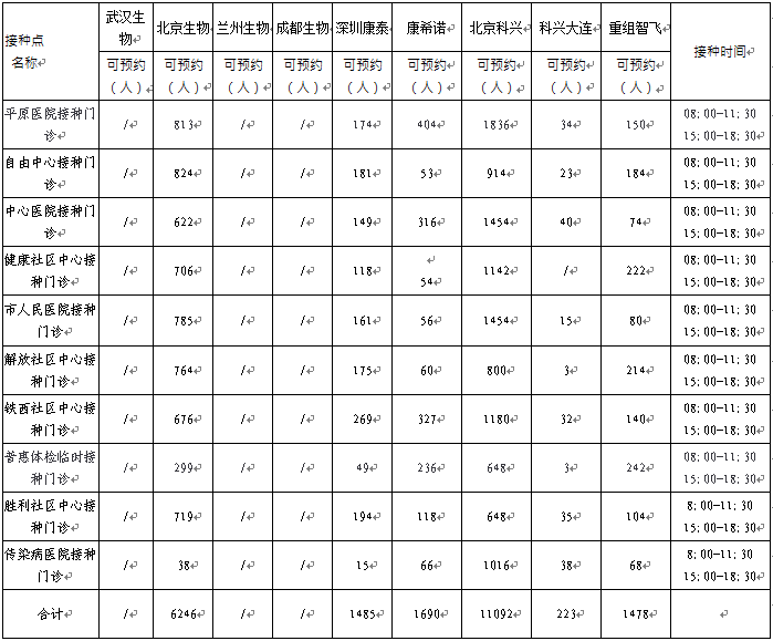 新冠病毒疫苗有北京生物、兰州生物、深圳康泰、北京科兴、科兴大连、重组智飞、康希诺。可以现场预约名额的接种点如下: