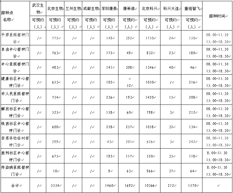 日,卫滨区新冠病毒疫苗有北京生物、兰州生物、深圳康泰、北京科兴、科兴大连、重组智飞、康希诺。可以现场预约名额的接种点如下: