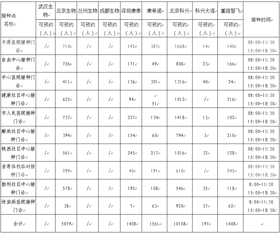 日,卫滨区新冠病毒疫苗有北京生物、兰州生物、深圳康泰、北京科兴、科兴大连、重组智飞、康希诺。可以现场预约名额的接种点如下:
