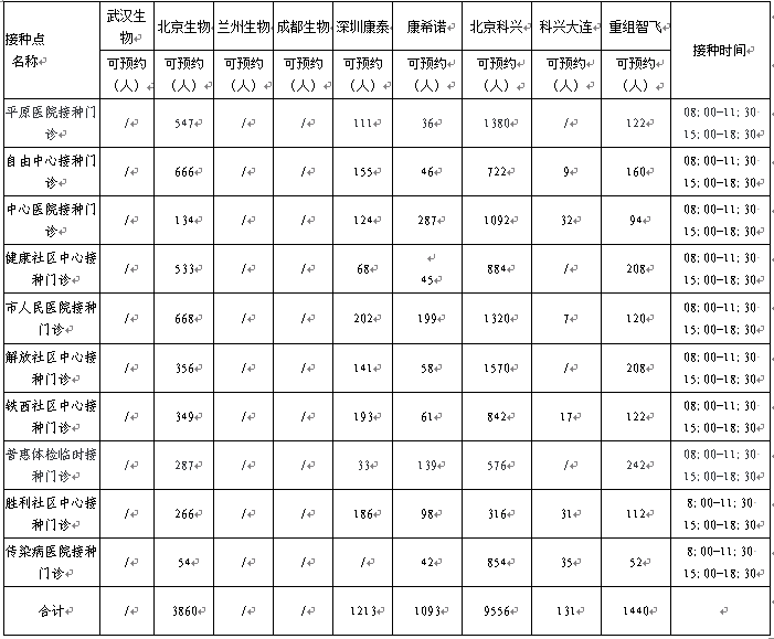 日,卫滨区新冠病毒疫苗有北京生物、兰州生物、深圳康泰、北京科兴、科兴大连、重组智飞、康希诺。可以现场预约名额的接种点如下: