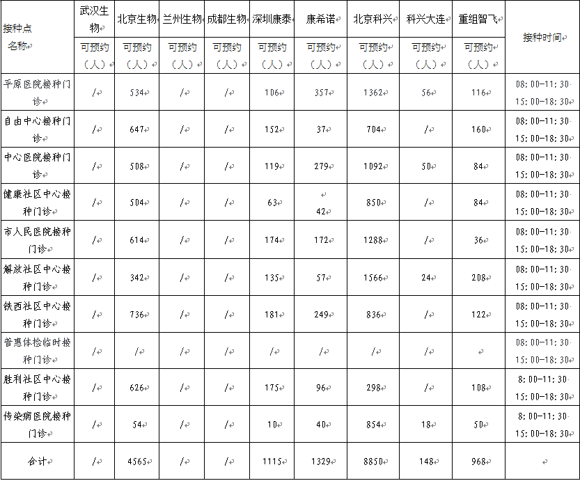 5月11日,卫滨区新冠病毒疫苗有北京生物、兰州生物、深圳康泰、北京科兴、科兴大连、重组智飞、康希诺。可以现场预约名额的接种点如下: