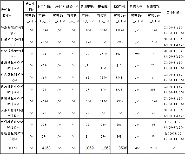 日,卫滨区新冠病毒疫苗有北京生物、兰州生物、深圳康泰、北京科兴、科兴大连、重组智飞、康希诺。可以现场预约名额的接种点如下:
