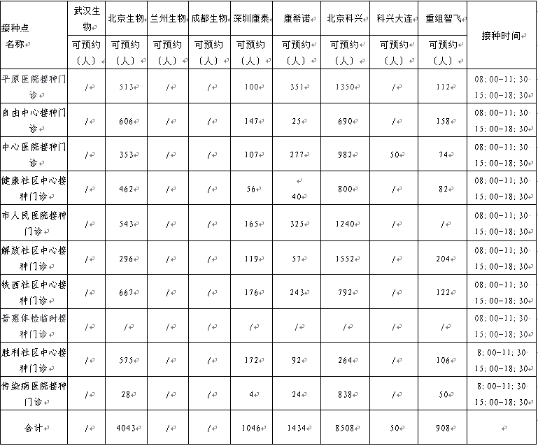 日,卫滨区新冠病毒疫苗有北京生物、兰州生物、深圳康泰、北京科兴、科兴大连、重组智飞、康希诺。可以现场预约名额的接种点如下: