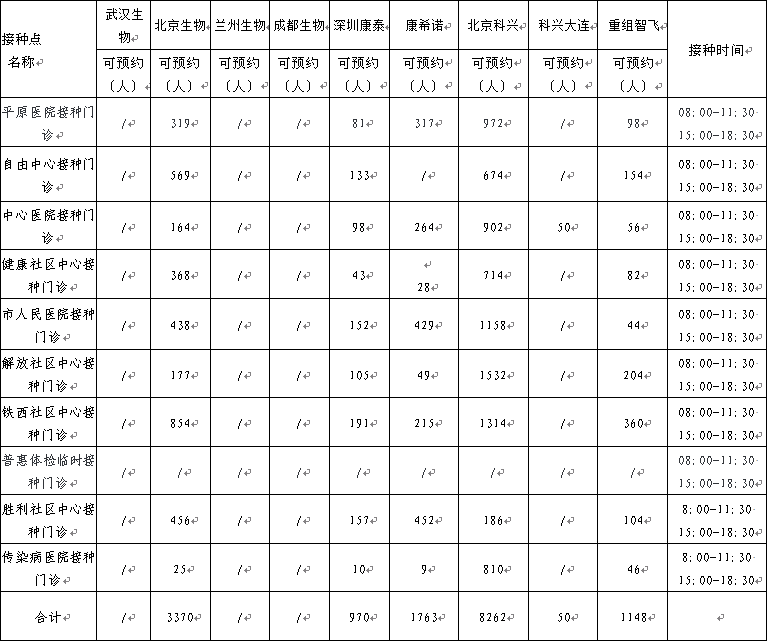 日,卫滨区新冠病毒疫苗有北京生物、兰州生物、深圳康泰、北京科兴、科兴大连、重组智飞、康希诺。可以现场预约名额的接种点如下:
