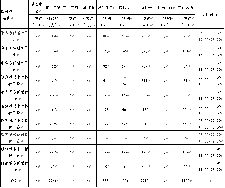 日,卫滨区新冠病毒疫苗有北京生物、兰州生物、深圳康泰、北京科兴、重组智飞、康希诺。可以现场预约名额的接种点如下: