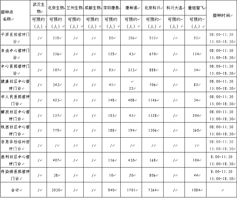 日,卫滨区新冠病毒疫苗有北京生物、兰州生物、深圳康泰、北京科兴、重组智飞、康希诺。可以现场预约名额的接种点如下: