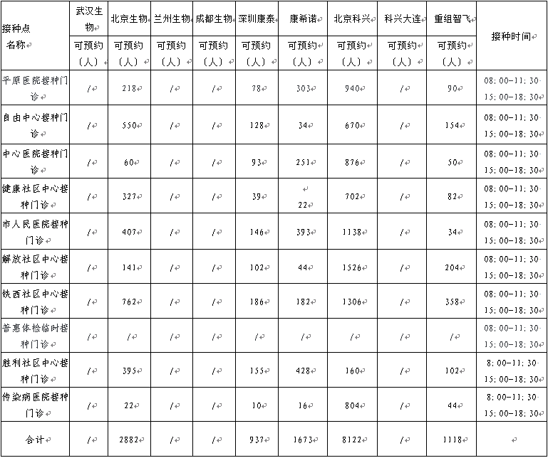 日,卫滨区新冠病毒疫苗有北京生物、兰州生物、深圳康泰、北京科兴、重组智飞、康希诺。可以现场预约名额的接种点如下: