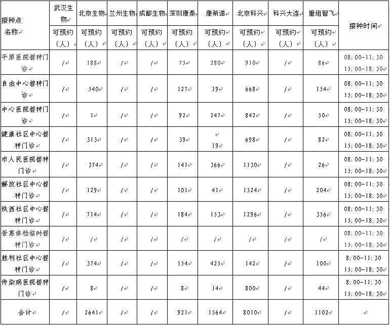 6月15日,卫滨区新冠病毒疫苗有北京生物、兰州生物、深圳康泰、北京科兴、重组智飞、康希诺。可以现场预约名额的接种点如下: