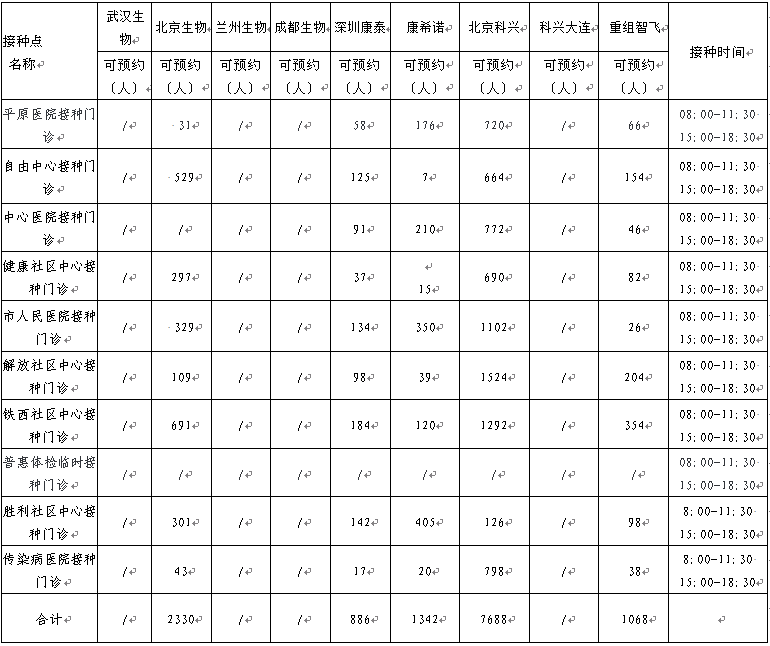 日,卫滨区新冠病毒疫苗有北京生物、兰州生物、深圳康泰、北京科兴、重组智飞、康希诺。可以现场预约名额的接种点如下: