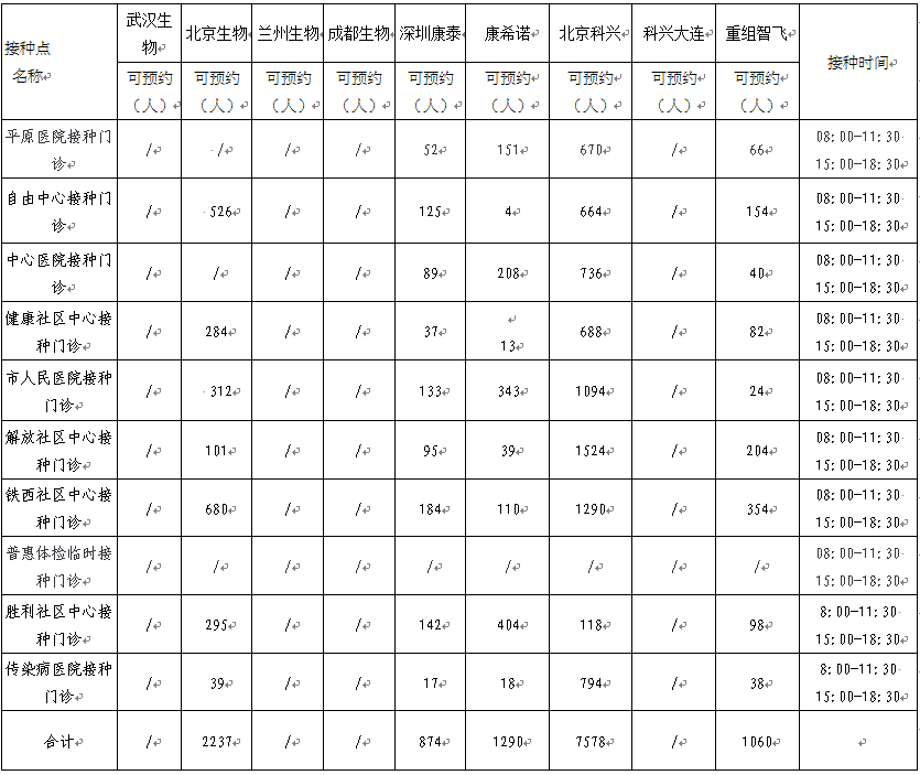 日,卫滨区新冠病毒疫苗有北京生物、兰州生物、深圳康泰、北京科兴、重组智飞、康希诺。可以现场预约名额的接种点如下: